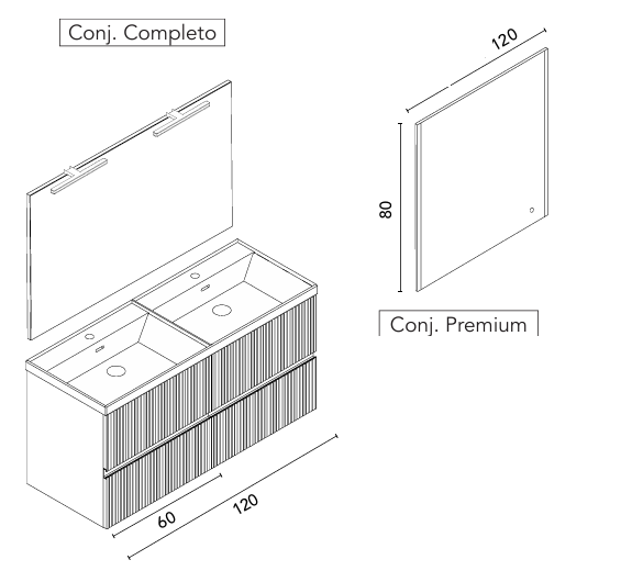 - Mueble + Lavabo cerámico Cairo blanco brillo doble seno + Espejo Aine iluminado. (Conjunto premium)